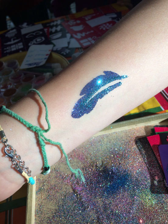 Glitzertattoos sind eine tolle Alternative zum klassischen Kinderschminken, die auch bei Jungendlichen und so manchen Erwachsenen gut ankommt. Ihre Gäste können sich eine der Motivschablonen aussuchen und bekommen dann ein funkelndes Tattoo aus hautfreundlichem Glitzer, das 4-7 Tage hält. Glitzertattoos sind wasserfest und lassen sich mit Öl (z.B. Kokosöl) und ein bissen Geduld durch leichtes Rubbeln entfernen.